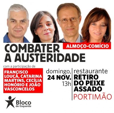 "Combater a austeridade!" é o tema do almoço-comício de dia 24 de novembro, domingo, em Portimão. Com a participação de Catarina Martins, Coordenadora Nacional do Bloco de Esquerda, Francisco Louçã, dirigente do Bloco, Cecília Honório, deputada, e João Vasconcelos, vereador na Câmara Municipal de Portimão, este será um dos mais importantes acontecimentos político no Algarve e no sul do país. Portimão figurou entre os melhores resultados para o Bloco de Esquerda nas últimas eleições autárquicas, passando de 4 para 9 autarcas (incluindo um vereador). Desta forma, impunha-se a realização de um grande comício nesta cidade que, no fundo, marcará o arranque para as eleições europeias do próximo ano. Trata-se de um comício a realizar nas vésperas da aprovação final do Orçamento de Estado para 2014, que corporiza um dos maiores ataques brutais através do agravamento de mais austeridade por parte do governo PSD/CDS e da troika contra o povo português. Impoe-se Juntar forças para combater a austeridade com toda a tenacidade.