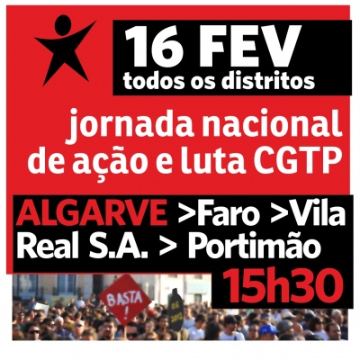 No dia 16 de fevereiro (sábado), a Grande Manifestação Nacional descentralizada da CGTP assume uma importância central na vida do nosso País. Para esta ação de luta todos/as estão convocados/as. É para aqui que deve ser encaminhada toda a revolta, insatisfação e indignação. É neste espaço que temos que dar expressão a um enorme coletivo para derrotar as atuais políticas e exigir a demissão de um governo que faz TERRORISMO SOCIAL.